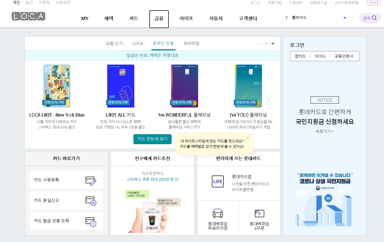 롯데카드 홈페이지는 PC에서 접속을 하여 로그인 후 활용을 하시면 됩니다. 이외에 모바일 같은 경우에는 홈페이지보다는 앱을 활용하게 됩니다.