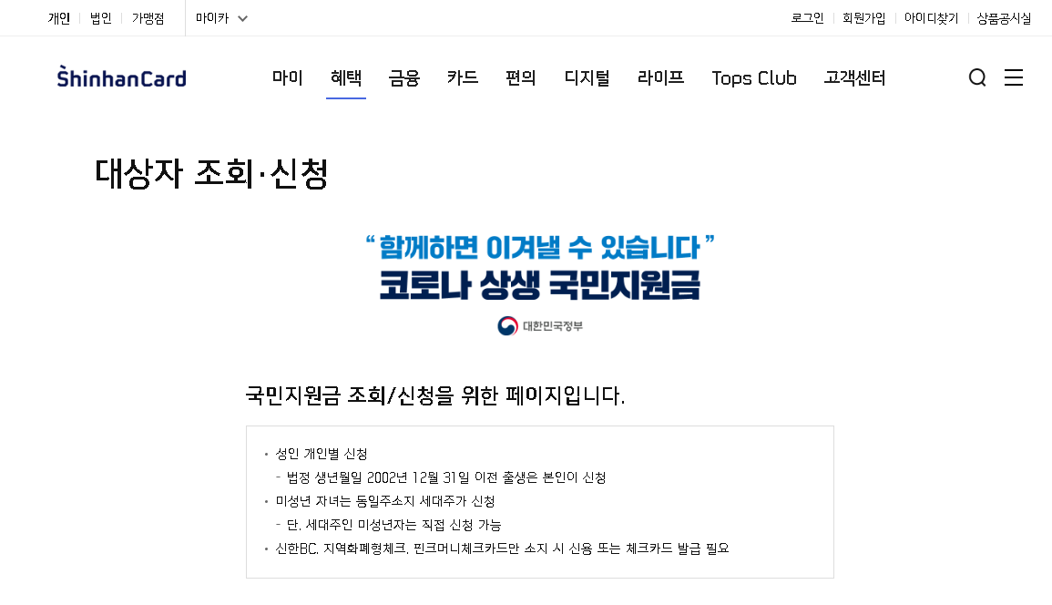 거기에 5차 재난지원금인 코로나 상생 국민지원금 신청 및 조회 역시도 가능합니다. 그럼 신한카드 이용에 홈페이지가 많은 도움이 되면 좋겠네요.