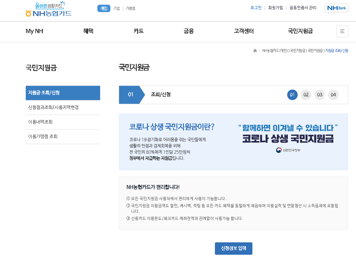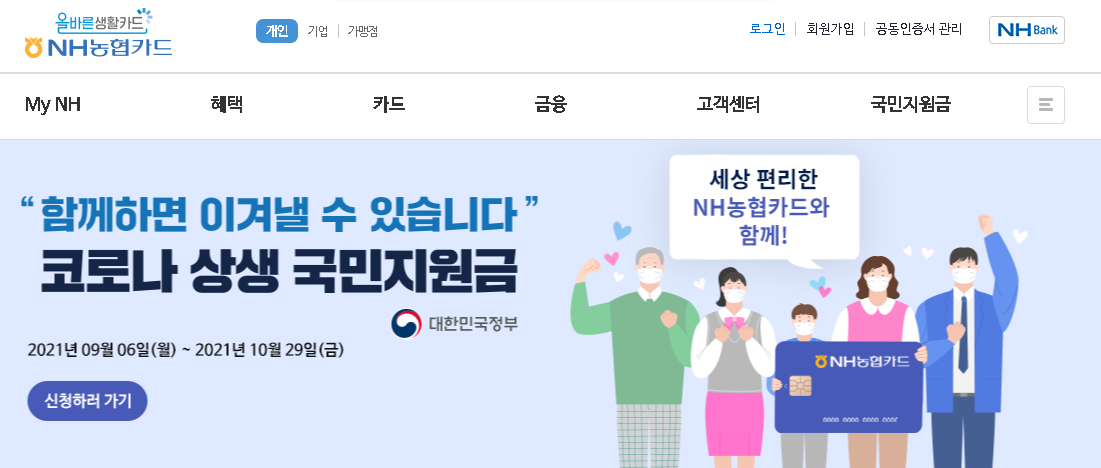 농협카드 홈페이지로 접근을 하시면 관련된 내용이 확인되며, 동시에 코로나 상생 국민지원금 신청 페이지를 확인 가능합니다. 10월 29일까지 신청이 되어진다고 하니 확인 후 진행하면 좋을 것 같습니다.