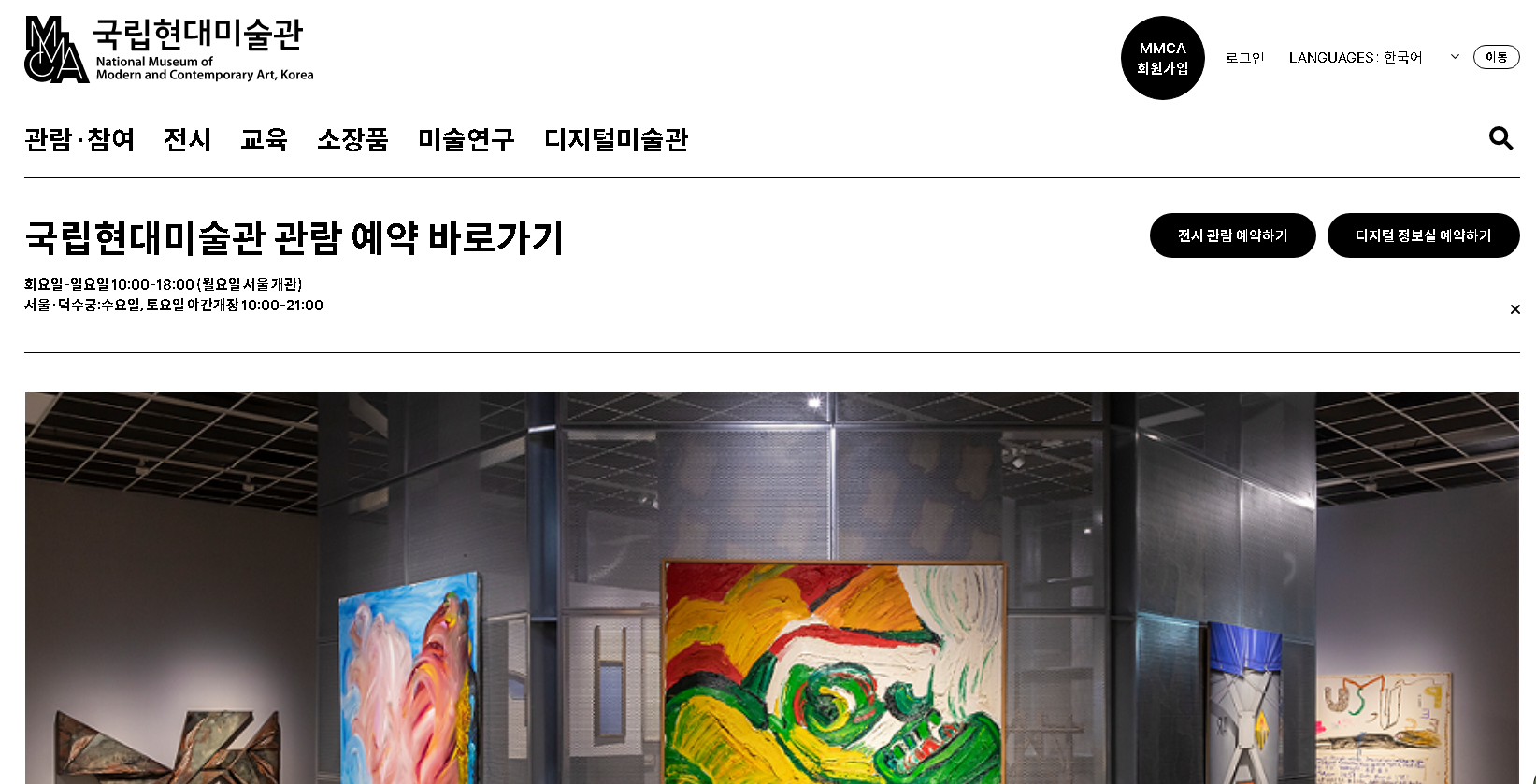 국립현대미술관 관람 예약을 진행할 수 있는 온라인 홈페이지입니다. 관람 참여, 전시, 교육, 소장품, 미술연구, 디지털 미술관 등에 대한 내용 확인하시고 이용하시길 바랍니다.
