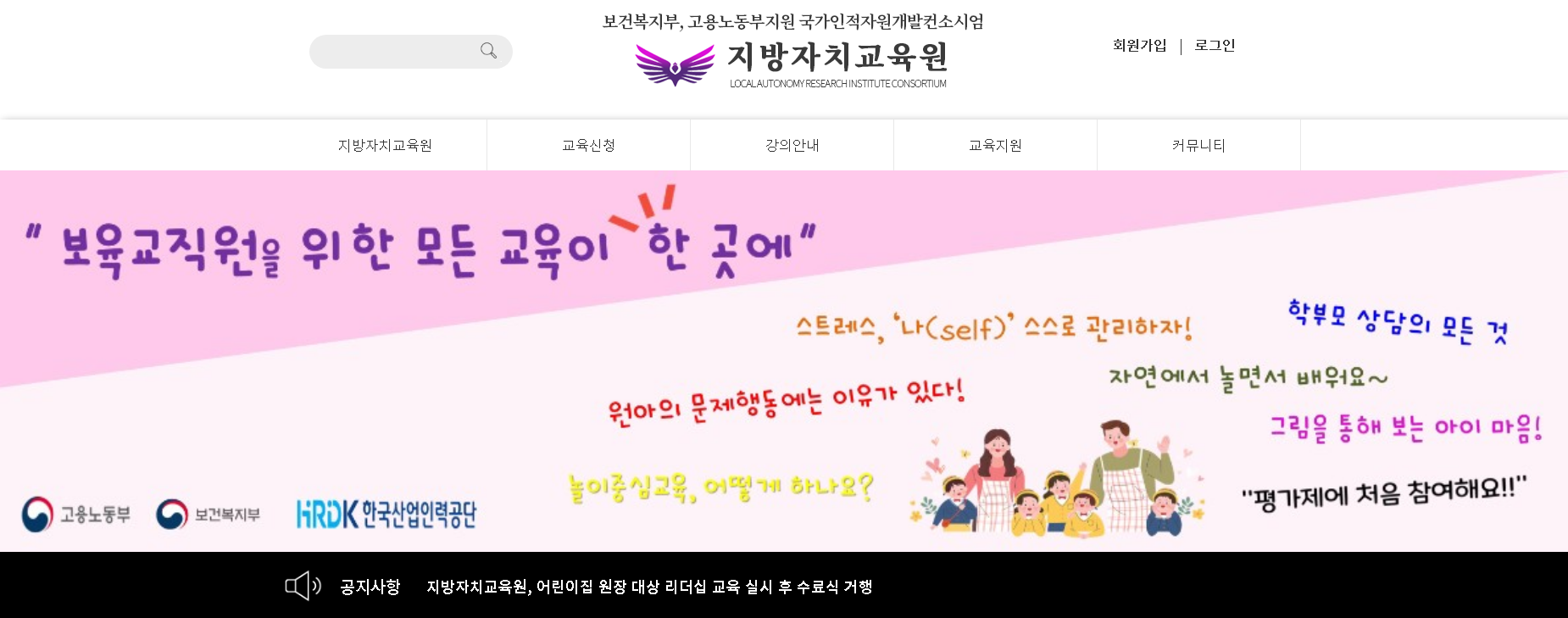 보건복지부, 고용노동부지원 국가인적자원개발컨소시엄으로 운영이 되어지는 지방자치교육원은 보육교직원을 위한 다양한 교육을 확인하실 수 있습니다.