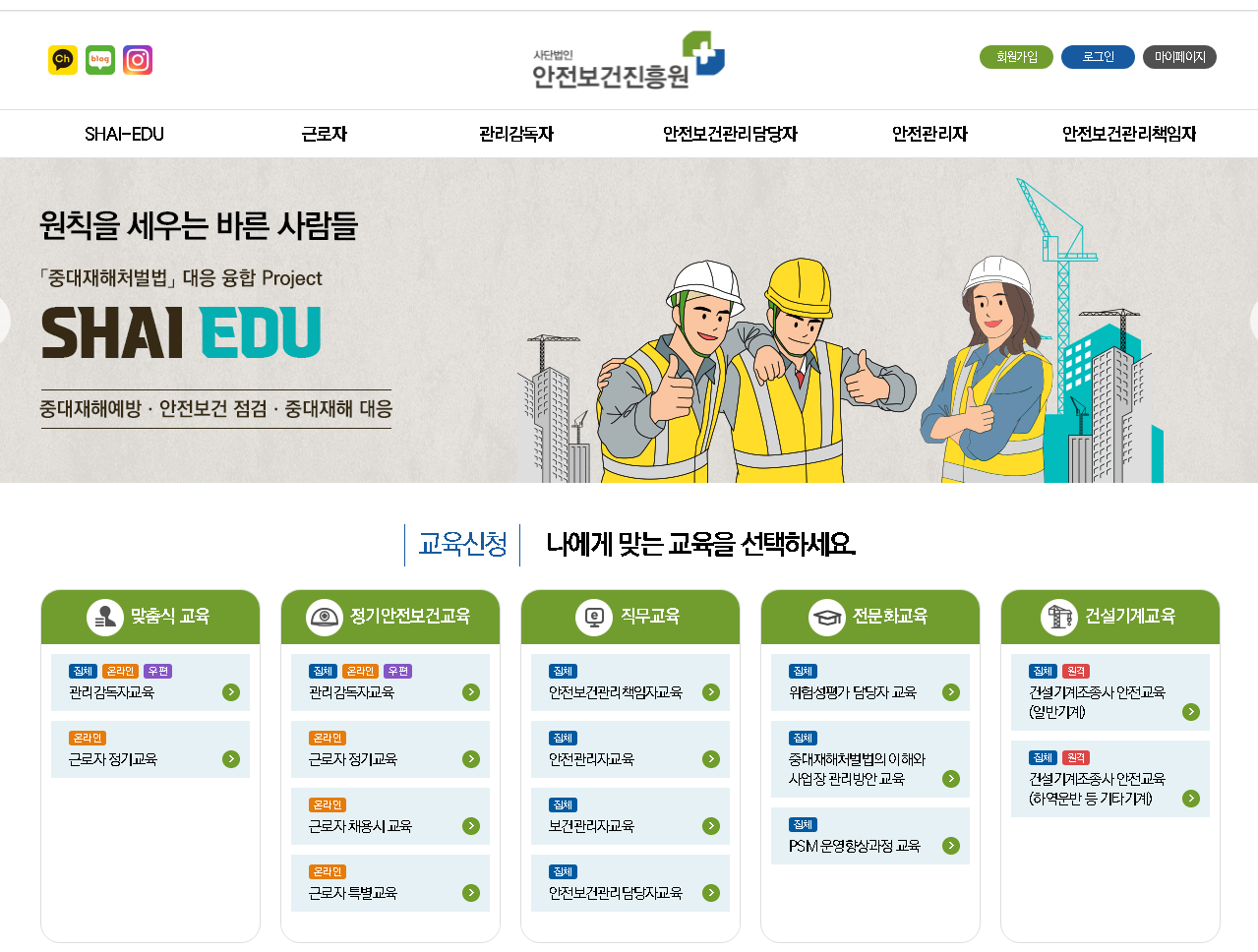 정기안전보건교육, 안전보건직무교육, 전문화교육, 건설기계교육 등을 확인하시고 이용해보세요.