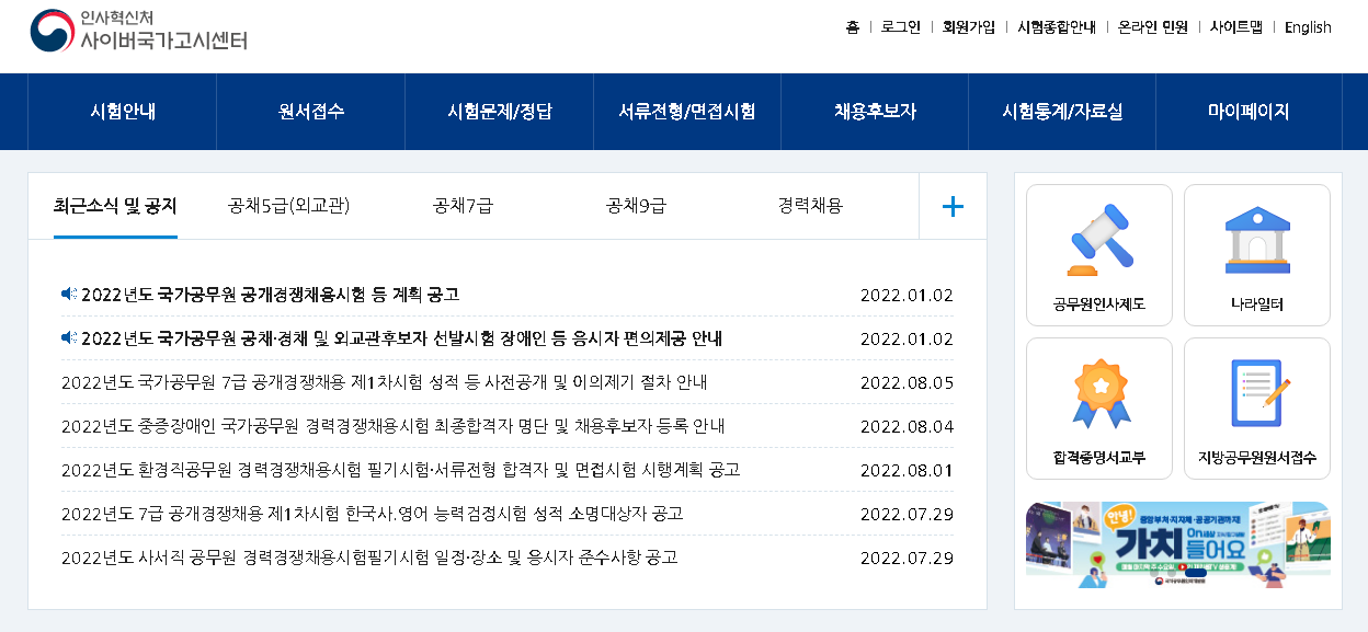 인사혁신처 사이버국가고시센터에 가보시면 공무원 채용에 관련된 내용을 확인하고 원서접수도 진행 가능합니다.