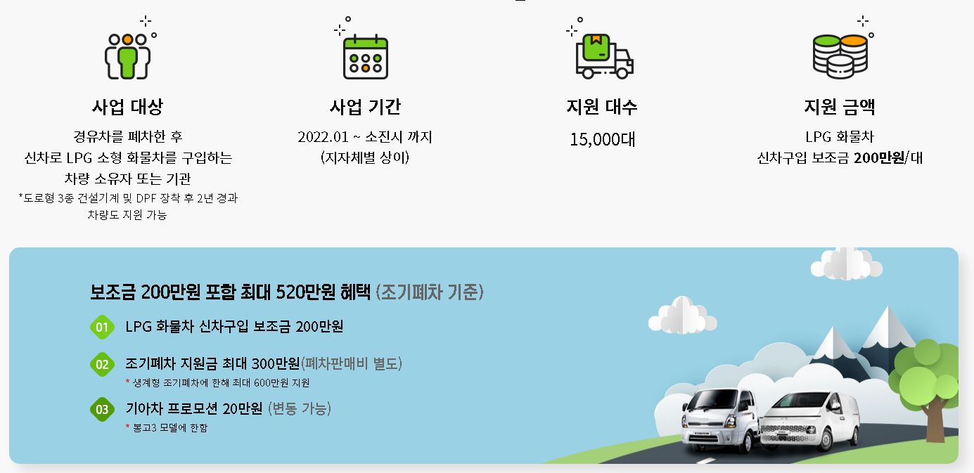 환경부와 대한LPG협회에서 지원하는 LPG화물차 신차구입 지원사업은 미세먼지를 줄이고 소상공인의 부담을 덜기 위하여 친황경 LPG화물차와 카고를 신차로 구입시 200만원의 보조금을 지원하는 사업입니다.