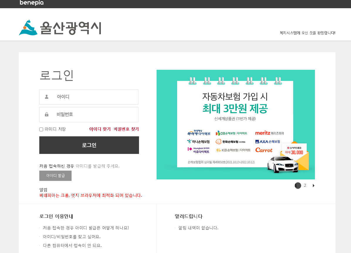 울산광역시 베네피아 복지시스템 (ulsan.benepia.co.kr)