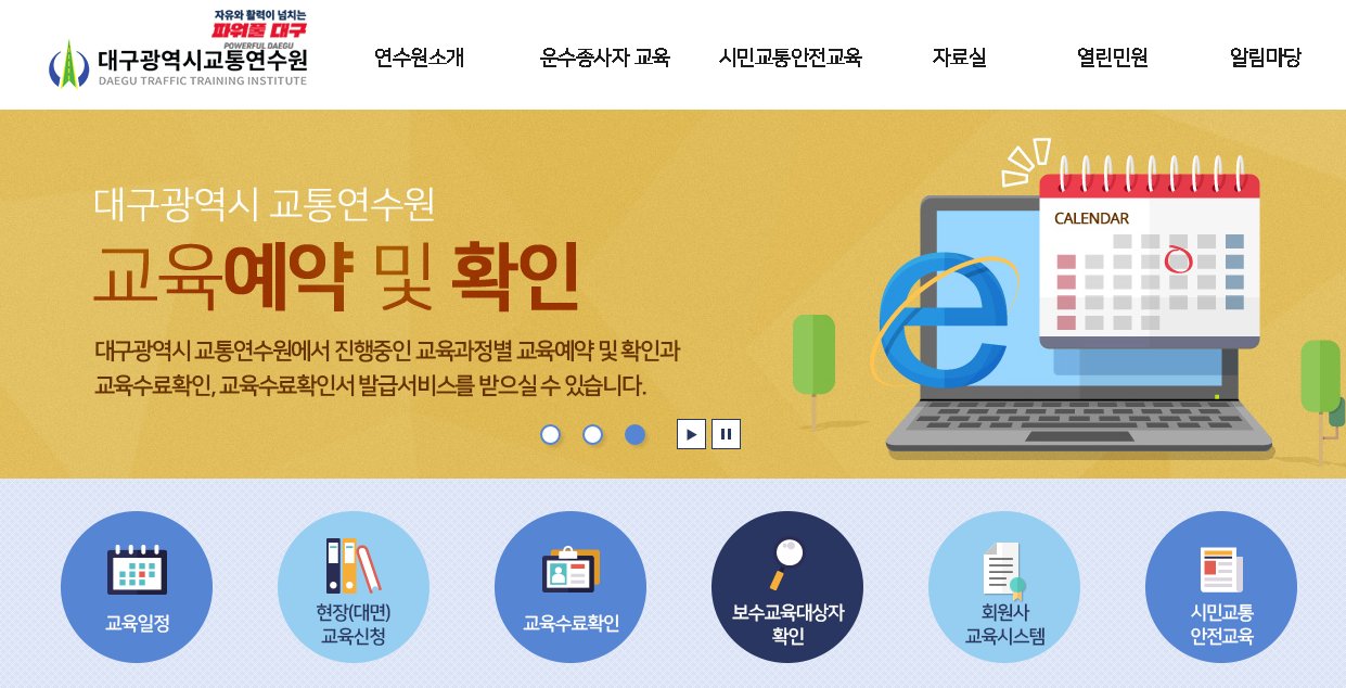 대구시에서는 운수종사자를 위하여 교통연수원 온라인 웹사이트를 운영하고 있습니다. 올해에는 현장(대면)교육으로 운수종사자 교육예약이 진행되며, 시민교통안전교육 역시 확인이 되어지니 확인 후 신청 진행해보시기 바랍니다.