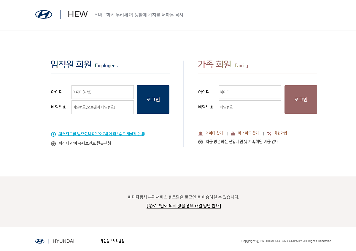 현대자동차 임직원이 이용할 수 있는 임직원 전용쇼핑몰이 운영되고 있습니다. 복지서비스로써 사번과 오토웨이 비밀번호를 통하여 접속하시고 복지포인트를 통하여 혜택을 누려보시기 바랍니다.