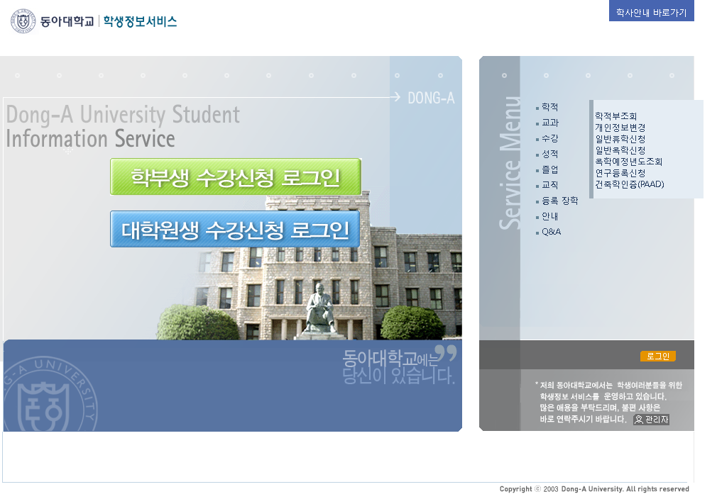 동아대학교 학생들이 이용할 수 있는 학생정보서비스가 운영되고 있습니다. 학부생 수강신청, 대학원생 수강신청이 진행되는 동아대학교 학생정보서비스 학생여러분들은 잘 확인후 이용하세요.