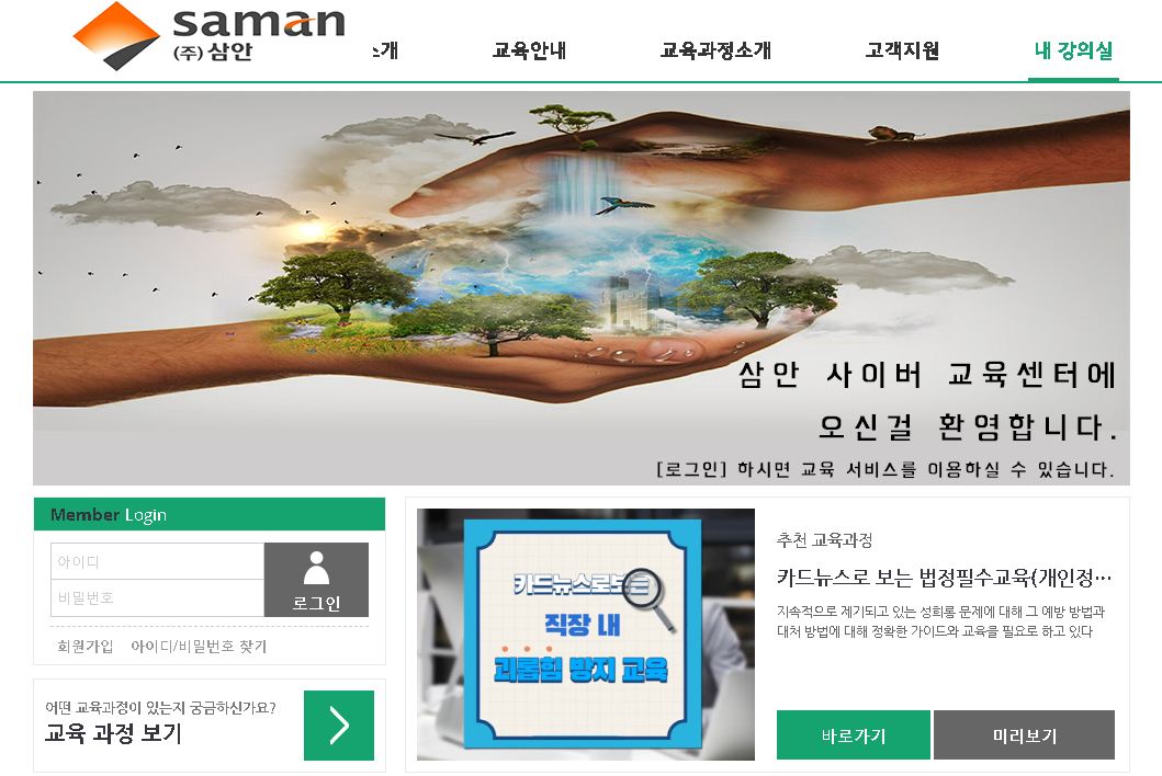 직장 내 괴롭힘 방지 교육과 같은 사업주 위탁교육을 이수 할 수 있는 삼안 사이버교육센터입니다. 법정필수교육 이수 시에 강의과정 확인하시고 수강 진행해보시기 바랍니다.