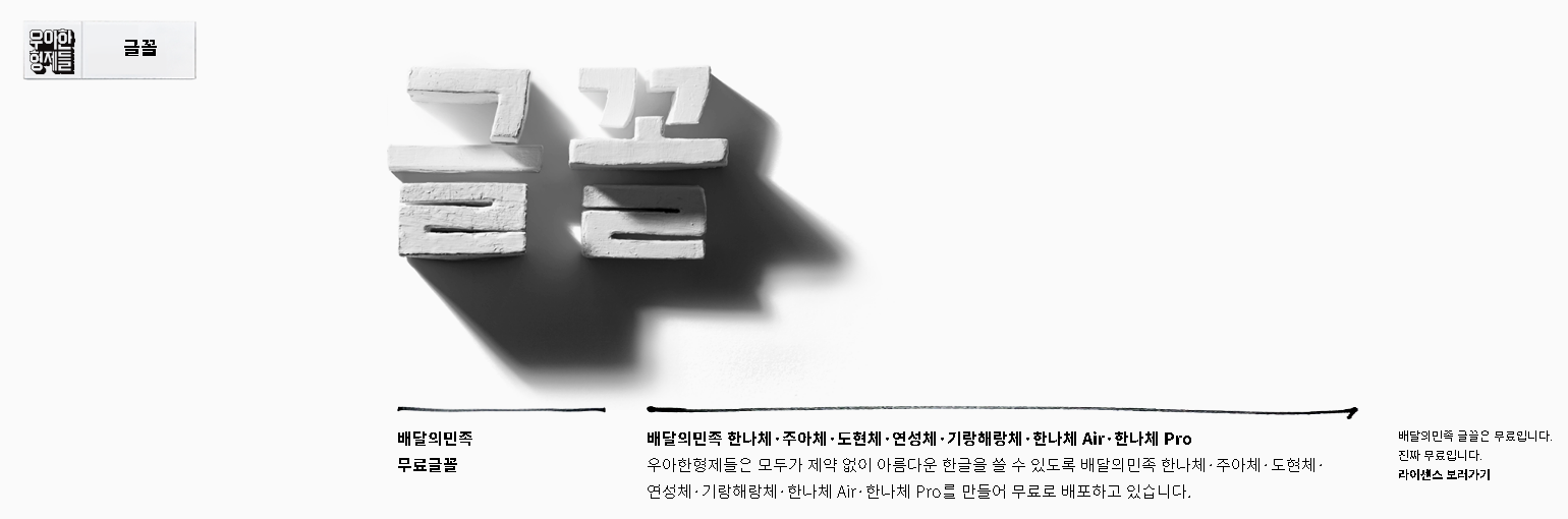 네이버 한글한글아름답게 사이트에서 나눔글꼴모음을 배포하여 다운로드 받으실 수 있습니다. 배달어플로 유명한 배달의민족에서도 무료폰트를 배포하고 있는데요.