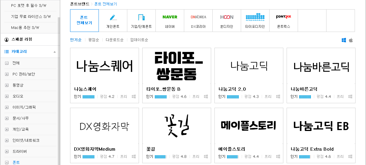 그 외에 다양한 무료폰트의 다운은 네이버소프트웨어에서 카테고리를 폰트로 하시면 찾으실 수 있어요. 프리 라이센스를 가진 폰트를 다운로드 받으시고 설치하셔서 이용하시면 되는데요.