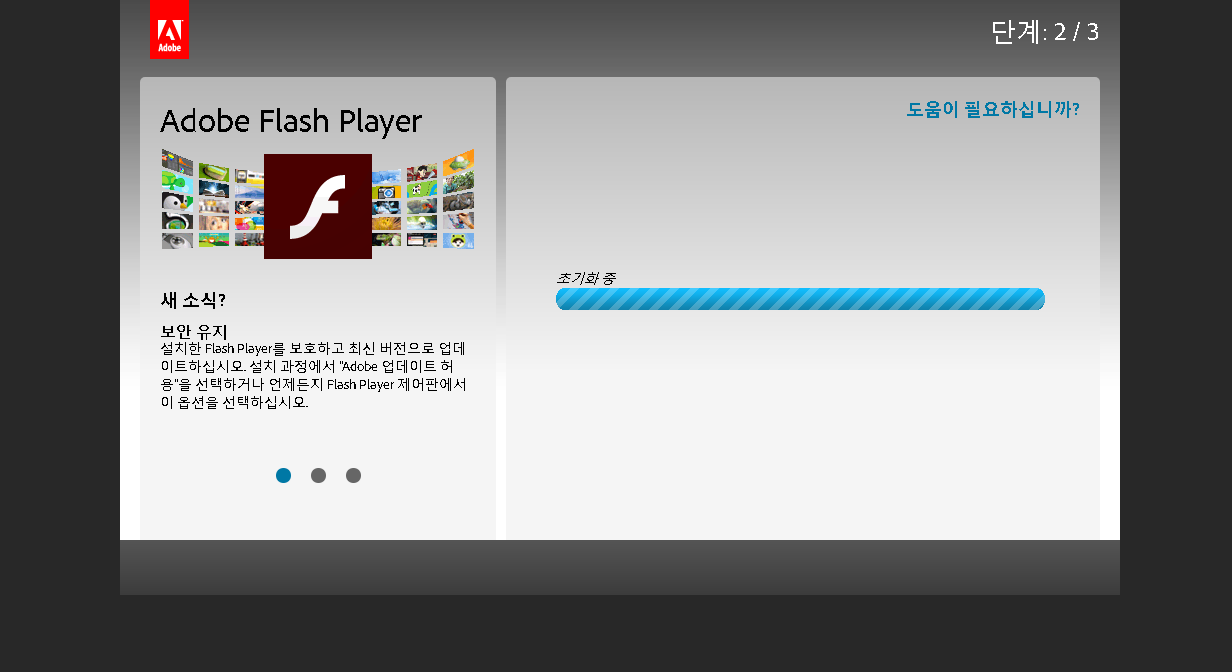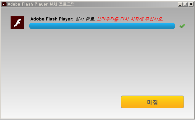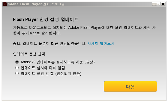 설치전에 어도비 플래시 플레이어 업데이트 관련한 옵션 설정이 우선적으로 진행이 됩니다. 설치완료 후에는 브라우저를 다시시작하면 웹에서 플래시플레이어를 통해 swf파일을 재생하실 수 있어요.