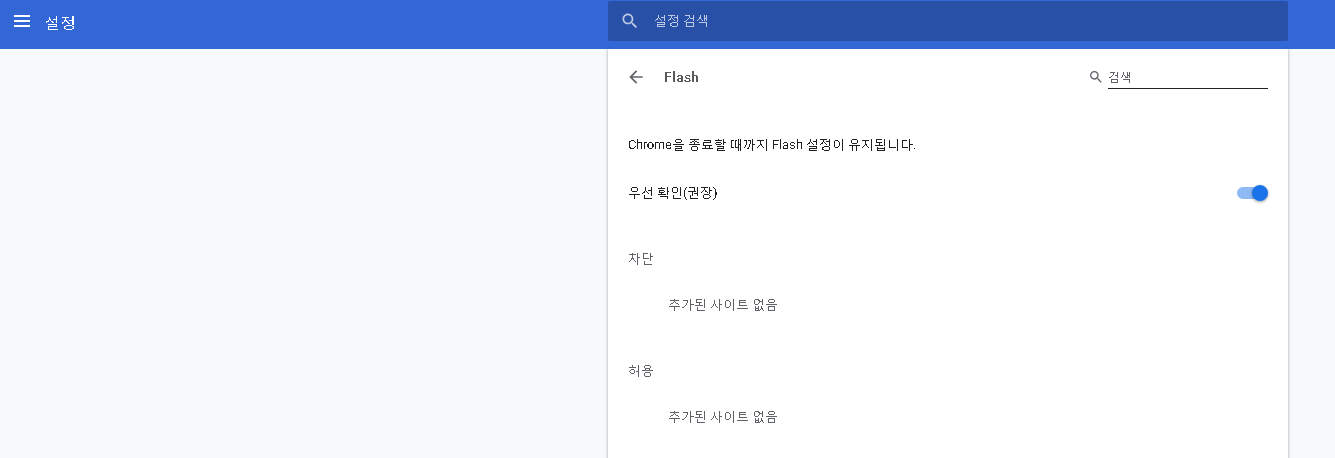 만일 최신버전의 어도비 플래시 플레이어를 다운로드 및 설치하셨는데도 불구하고 플래시미디어의 재생이 되지 않는다면 브라우저에서 차단이 되어 있는 경우인데요. 이럴 때는 어도비 플래시 플레이어 활성화 설정을 해주셔야 합니다. 대부분 요즘에는 우선 확인 설정이 권장으로 되어 있는 것 같네요. 크롬같은 경우는 설정 > 고급 > 개인정보 및 보안 > 콘텐츠 설정 > Flash에서 관련 옵션을 확인 가능합니다.