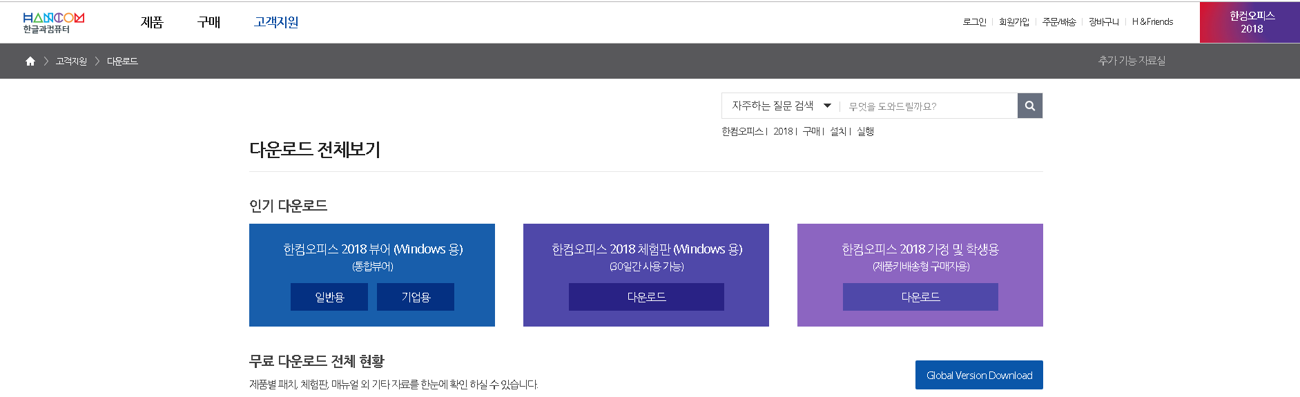 한글과컴퓨터에서 제공하는 최신버전의 한글뷰어의 pc버전은 공식홈페이지에서 배포를 진행하고 있는데요. 한컴 고객지원 다운로드센터에 보시면 2018버전 통합뷰어 프로그램이 배포되고 있습니다. 개인사용자는 일반용으로 기업사용자는 기업용으로 받으셔야 해요.