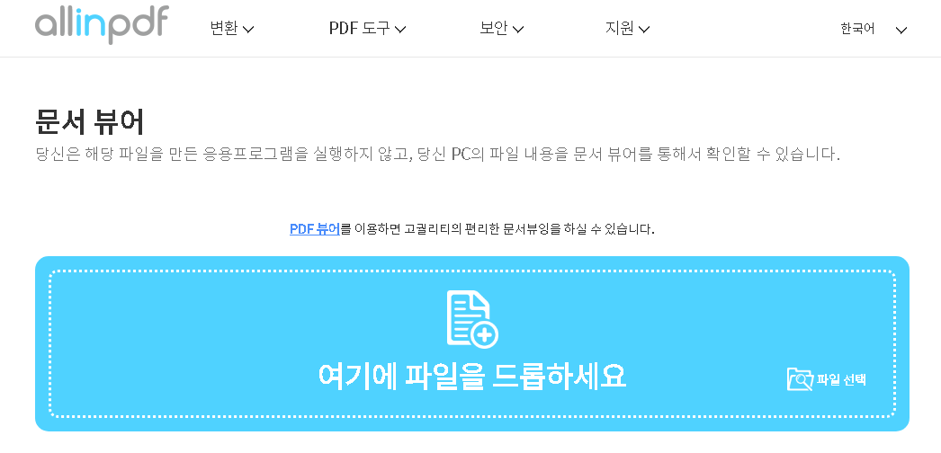 아예 설치과정없이 한글뷰어를 다운로드하지 않고 무설치로 이용하고 싶다면 allinpdf 사이트에서 지원하는 온라인 솔루션을 이용하시면 됩니다.
