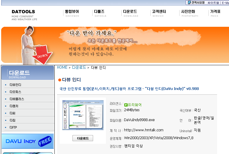 통합뷰어로써 hwp파일 및 다양한 파일포맷을 이용가능한 가벼운 프리툴로써는 다뷰 인디가 존재합니다. cad, pdf를 포함하여 250여가지의 포맷을 지원하는 툴인데요. 온라인 기반으로 동작하기 때문에 프로그램 다운로드 및 설치과정에서 오랜 시간이 걸리지 않습니다.