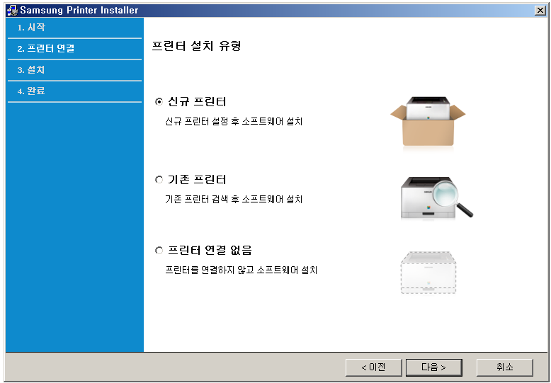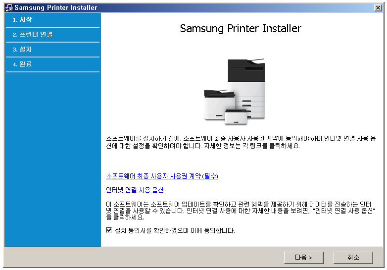 소프트웨어 사용권 계약 동의를 하시고 신규 프린터인지 기존의 프린터인지 선택 후 삼성프린터드라이버 연결을 진행해주세요.