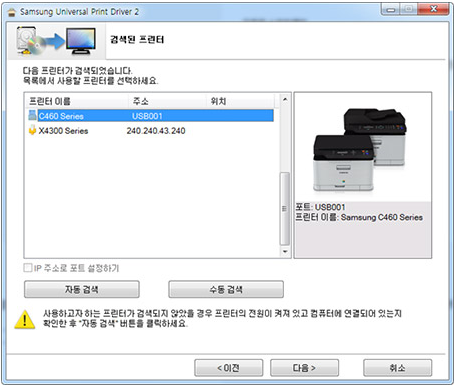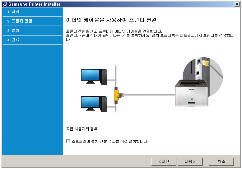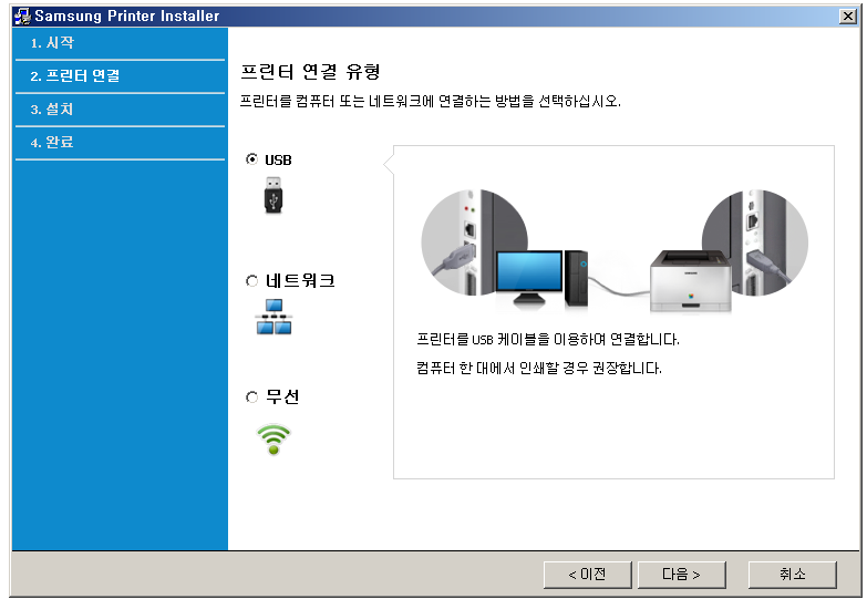 연결방식은 USB, 네트워크, 무선 이렇게 3가지 타입이 있는데요. 일반적으로 가정용으로는 USB로 직접 연결을 하시는 경우가 많고 회사에서는 네트워크로 ip주소기반으로 삼성프린터의 드라이버연결을 진행합니다.