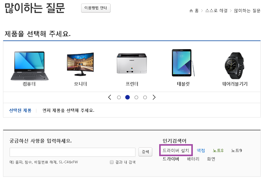 이미 많은 분들이 삼성프린터의 드라이버설치에 대해 관심과 궁금점을 질문하기 때문에 인기검색어에 관련항목이 보이는데요. 여기에서 드라이버 설치 항목으로 들어가주시거나 아니면 직접 검색을 해주세요.