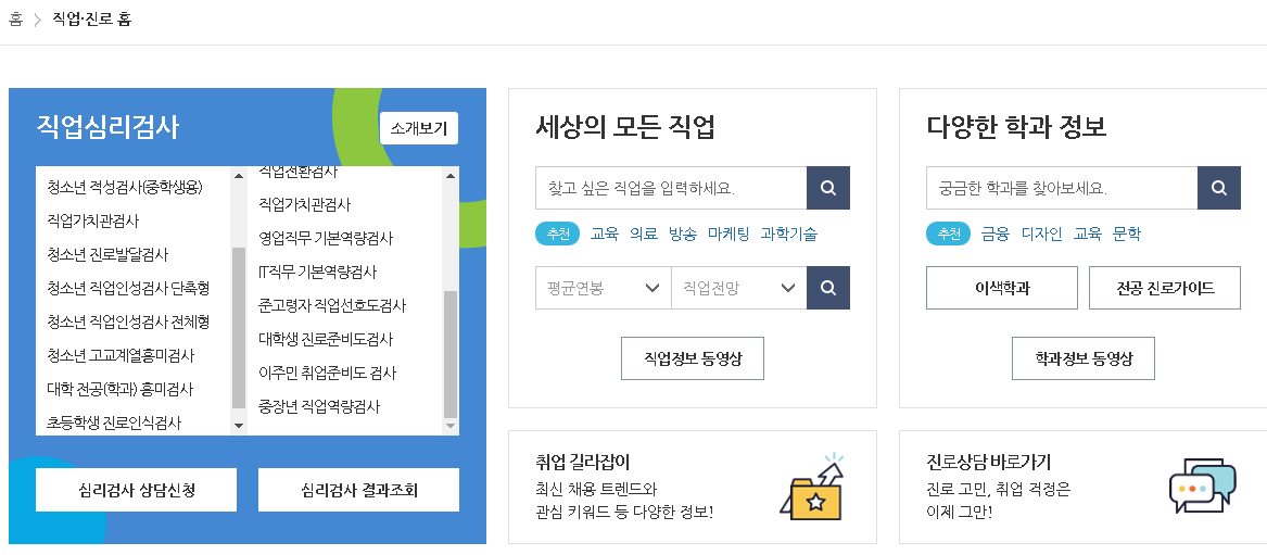 단순 일자리를 구하는 서비스를 제공하는 것에 그치지 않고 직업심리검사나 진로상담 서비스를 제공해주어 더욱 효과적인 워크넷 구인구직인데요. 따라서 서비스를 이용하여 미리 자신의 적성을 파악해보시는 것은 어떻까 싶습니다.