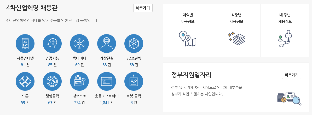 현재 진행되고 있는 4차산업혁명에 관련되어 주목할만한 일자리 정보를 worknet에서는 분류를 해주구요. 정부지원일자리를 따로 찾으실 수도 있습니다.