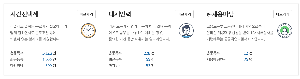 시간제, 대체인력, e-채용마당을 이용하시는 분들 역시 워크넷구인구직 시스템을 활용하시면 효율적으로 보이네요. 상세페이지로 들어가서 조건을 더 구체화시켜 맞는 구인구직을 진행해보시기 바랍니다.