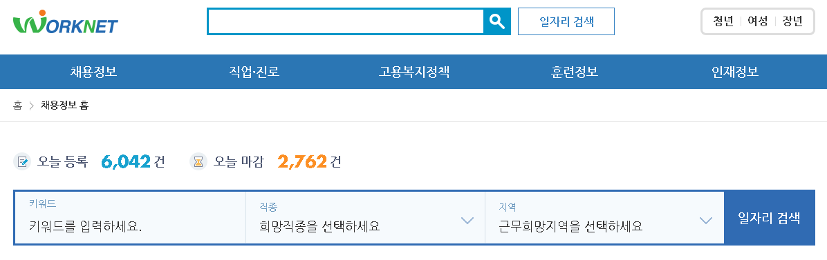워크넷 구인구직에 관련된 정보를 확인하기 위해서는 채용정보 페이지로 이동하시면 되는데요. 오늘 등록된 일자리와 마감된 정보 그리고 키워드/직종/지역별로 일자리를 검색하실 수 있습니다.