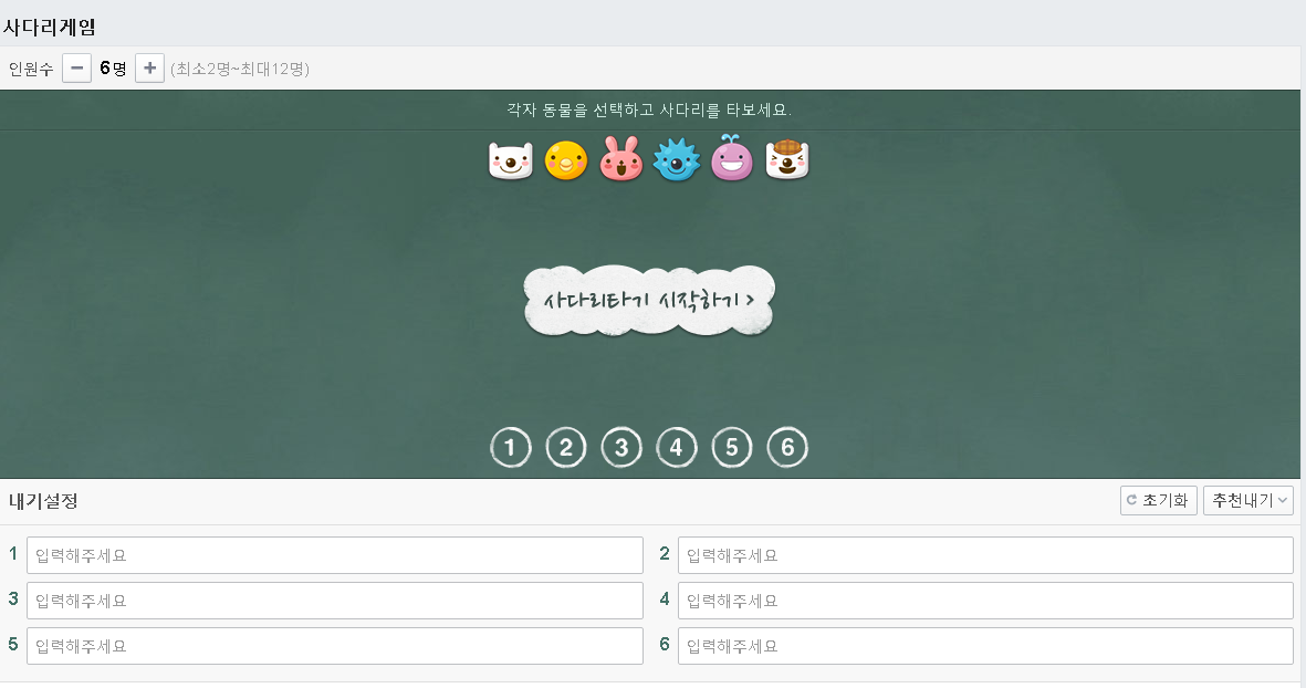 네이버 사다리게임의 참여인원은 최소 2명에서 최대 24명까지 지정이 가능하구요. 인원을 지정하신 후에 시작을 해두시면 사다리타기게임 화면이 나와 위쪽이름항목과 아래쪽 땅첨항목을 작성 가능합니다.