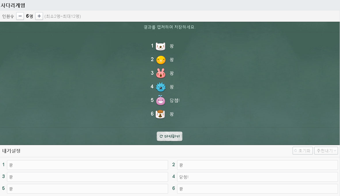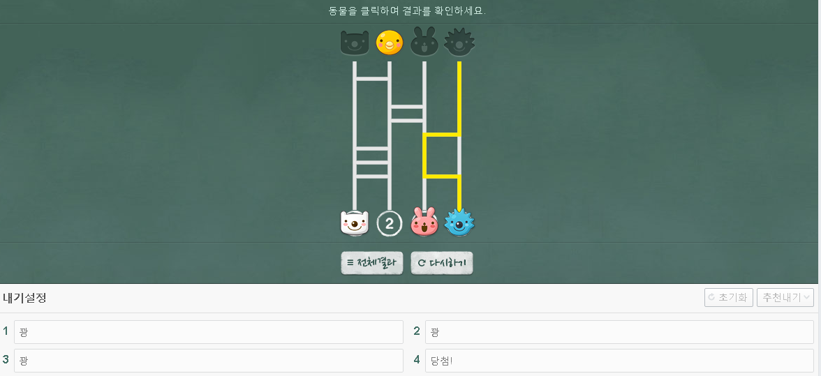 모든 항목의 작성이 완료되셨으면 사다리 시작을 통해 사다리타기게임을 진행하시면 되구요. 인원을 바꾸시거나 초기화를 원하신다면 돌아가기를 해주시면 됩니다.