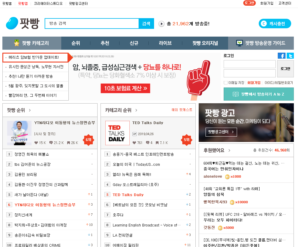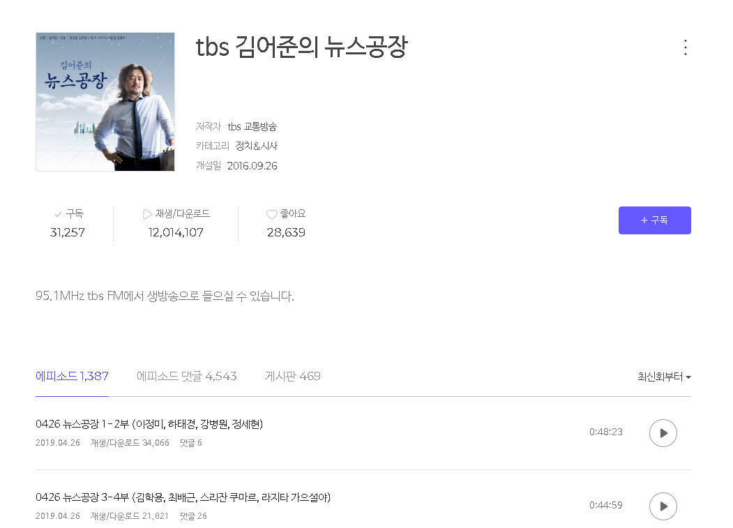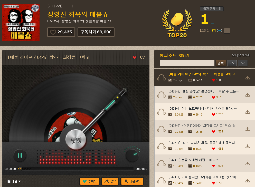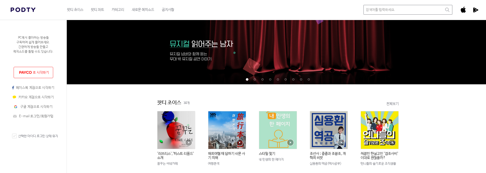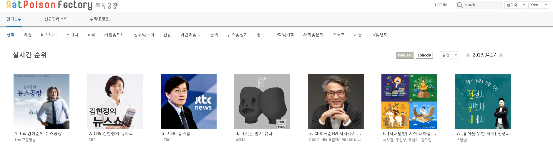 팟티 홈페이지에서 차트나 카테고리를 확인하시고 원하는 팟캐스트 방송의 회차를 재생 및 다운로드 그리고 구독이 가능합니다.