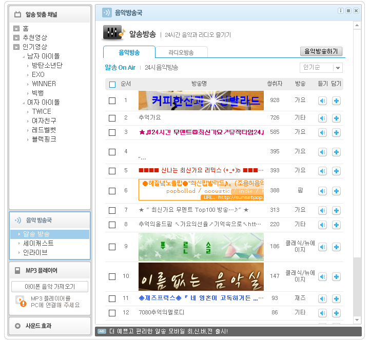 알송 pc 플레이어 같은 경우는 음악 방송 서비스도 제공하는데요. 알송 방송과 세이캐스트, 인라이브를 통해서 진행되는 인터넷뮤직방송을 라이브로 듣기가 가능합니다.
