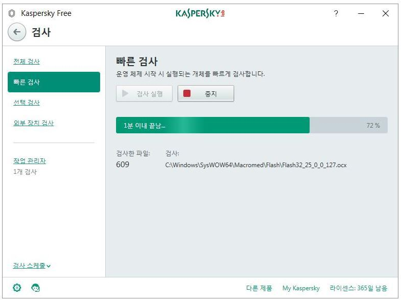 설치가 완료되셨으면 자신의 pc에 문제가 있는지 여부를 검사를 통해서 확인을 해주시면 됩니다. 세계적으로 인정받은 백신엔진을 사용하는 카스퍼스키 프로그램이기 때문에 검진율은 믿을만 한 것 같네요.