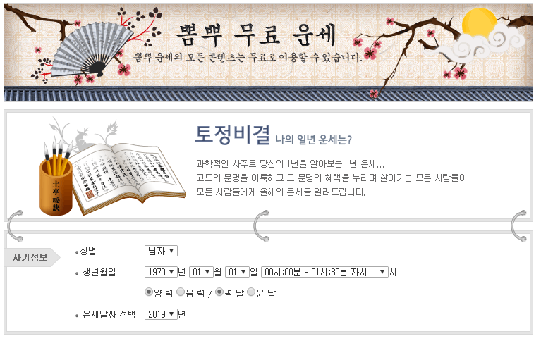 토정비결 서비스에서는 성별, 생년월일, 태어난시, 운세를 보고자 하는 년도를 설정해두시면 종합 일년 운세와 월간 사주를 보실 수 있네요.