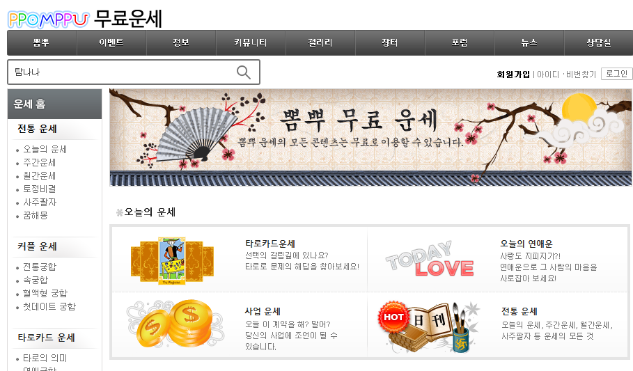 메인홈페이지 상단의 메뉴에서 정보 > 무료운세 항목으로 이동하시면 뽐뿌 무료사주 서비스 페이지로 들어가실 수 있는데요. 뽐뿌 무료운세 홈에는 전동운세, 커플, 타로카드, 퓨전 사주를 확인 가능합니다.
