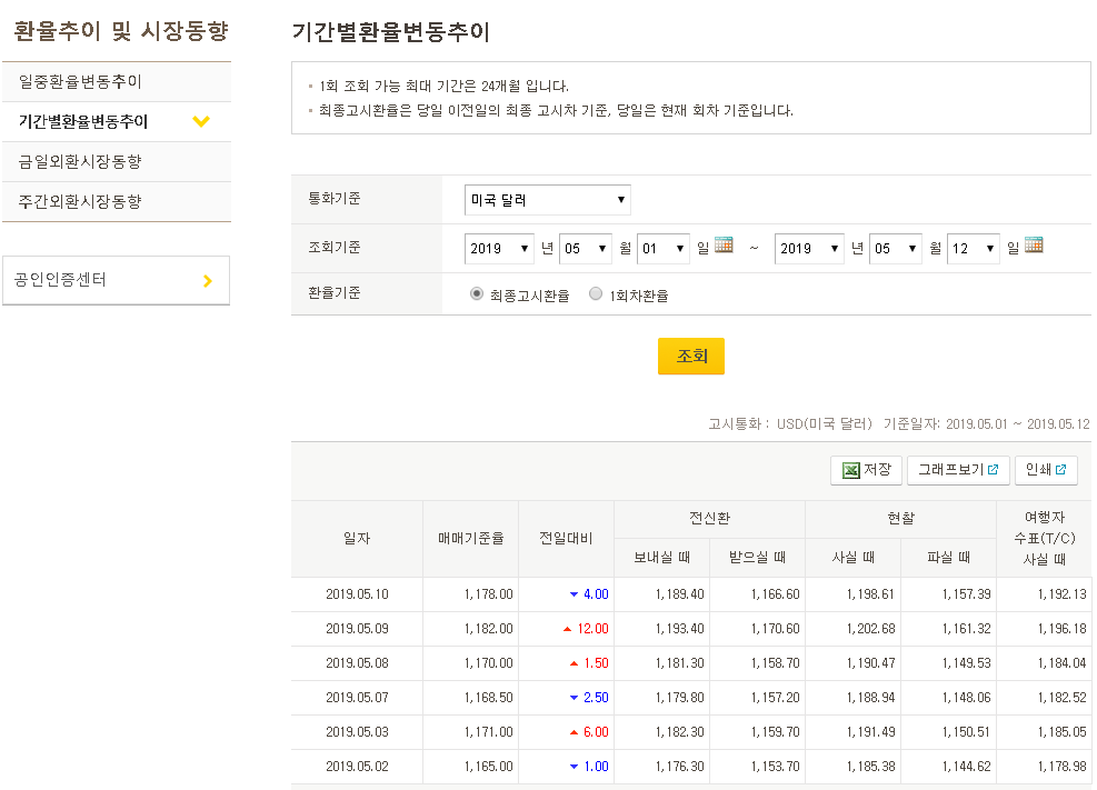 환율추이 및 시장동향 서비스를 이용하시면 기간에 따라 환율이 어떻게 변화하였는지 표와 그래프로 간략하게 확인이 가능한데요. 과연 지금 올라가고 있는 추세가 얼마까지 이어질지 그래프를 통한 분석으로 예측을 해보세요.