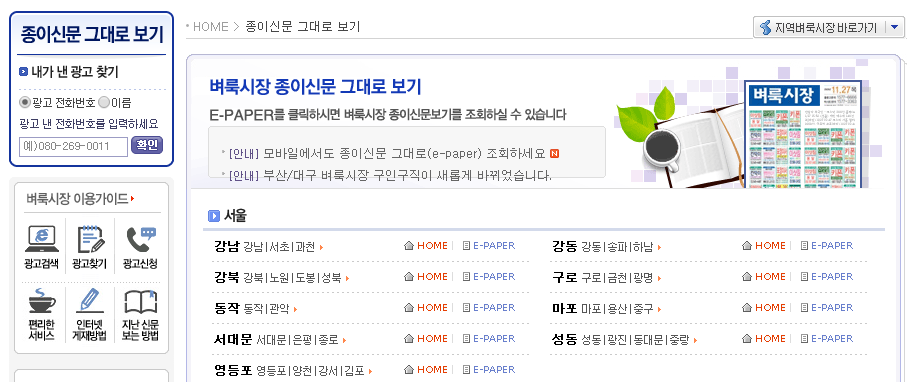벼룩시장에서 제공하는 종이신문 그대로보기 서비스에서는 지역벼룩시장 바로가기와 더불어 E-PAPER로 발간된 신문보기를 제공하는데요.