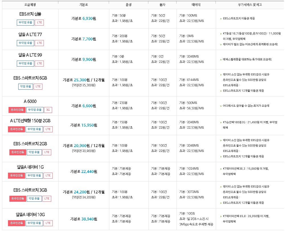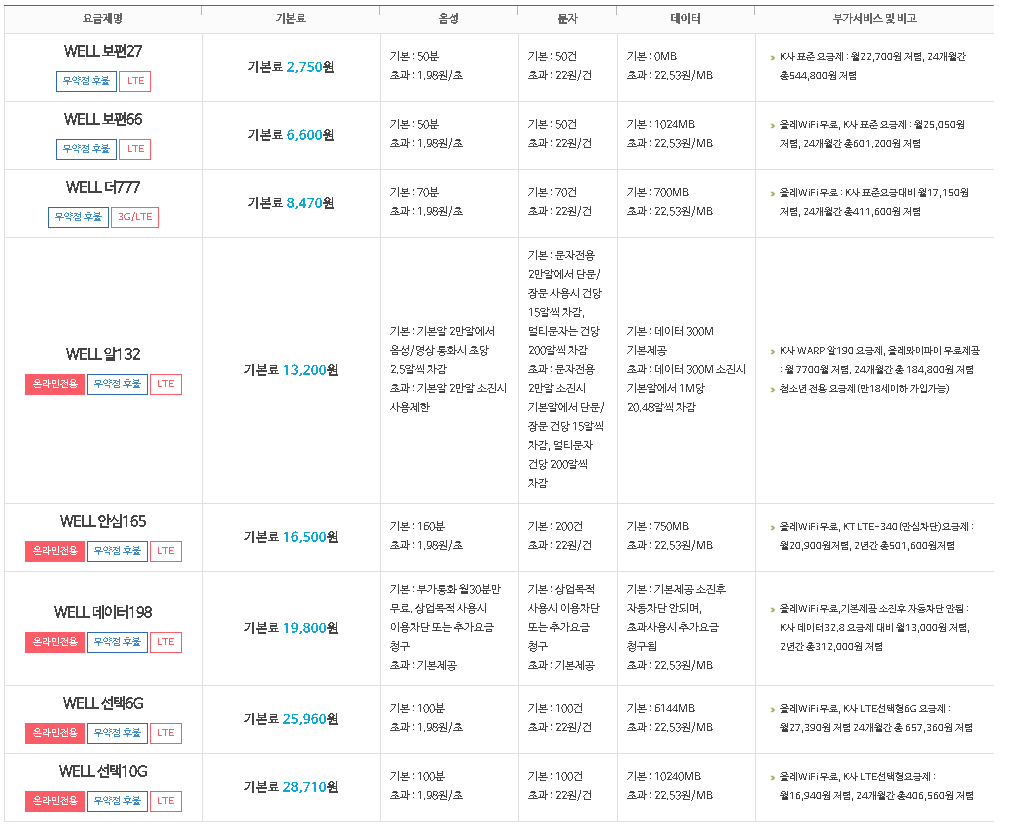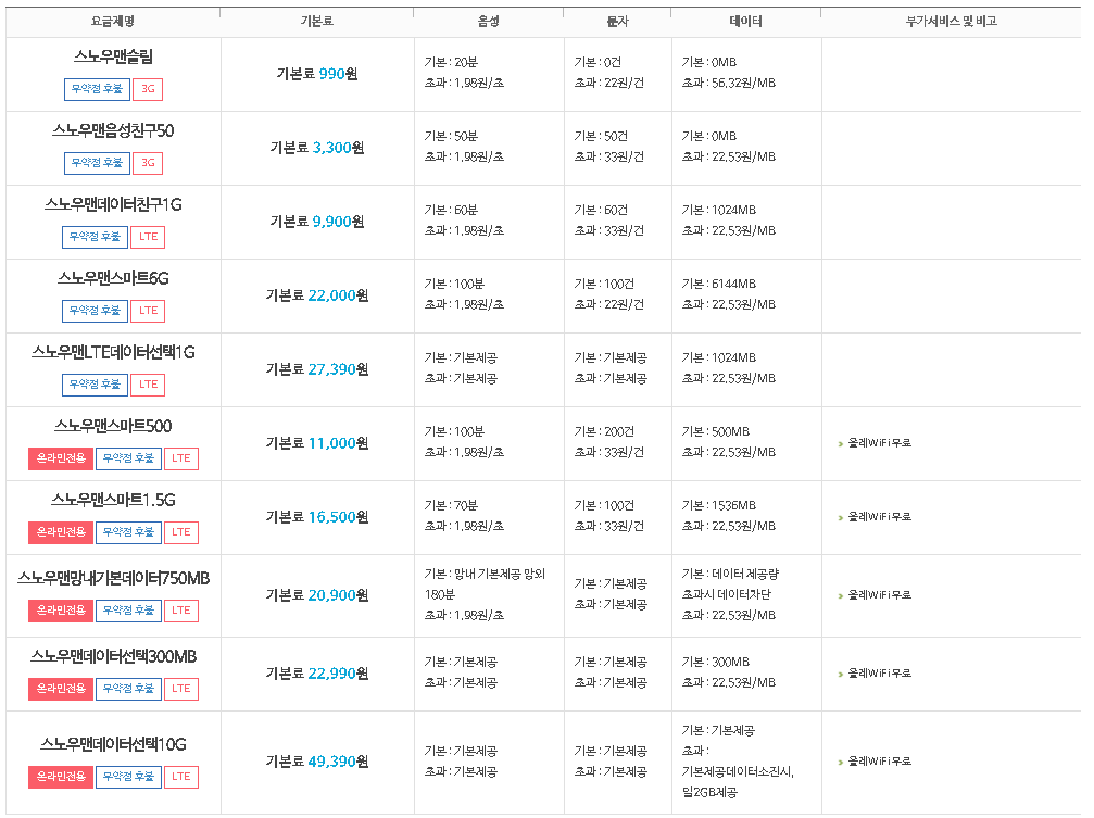 선불폰, 약정, 무약정, 3g, LTE 모델에 따라 기본료, 음성/문자/데이터 제공량 및 부가서비스를 잘 확인하시고 괜찮은 요금제를 찾아 가입을 시도해보시는 건 어떨까 싶네요.