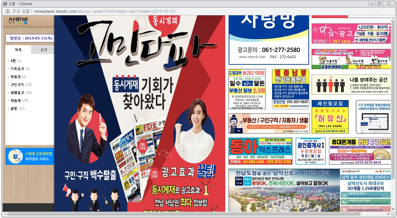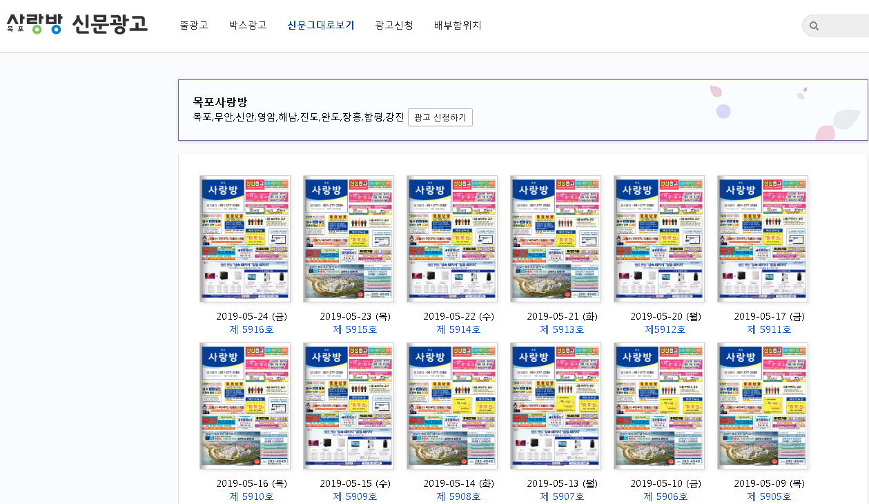 목포사랑방홈페이지 중단에 보시면 신문그대로보기 항목이 존재하는데요. 이를 통해 목포사랑방 종이신문을 인터넷으로도 간편하게 보실 수 있습니다.